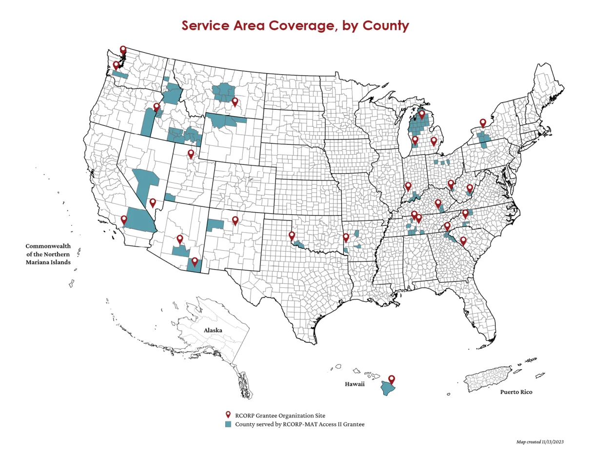 RCORP-MAT Access endeavors to establish new MAT availability points as part of a comprehensive, whole-person response to SUD. Grantees receive up to $1 million each, over a 3-year POP, to implement activities to provide both medications and supportive services to individuals with OUD and/or alcohol use disorder in rural communities.