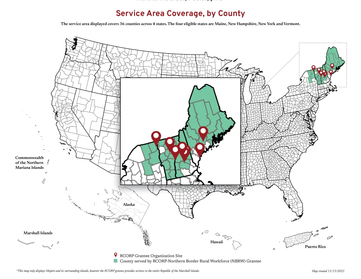 RCORP–Northern Border Rural Workforce (RCORP-Northern Border) aims to improve health care in rural areas within the Northern Border Regional Commission’s service area (Maine, New Hampshire, New York, Vermont) by enhancing behavioral health workforce capacity. Grantees receive up to $400,000 per year, over a 4-year POP, to implement activities aligned with the following, overarching program goals: